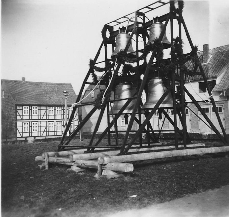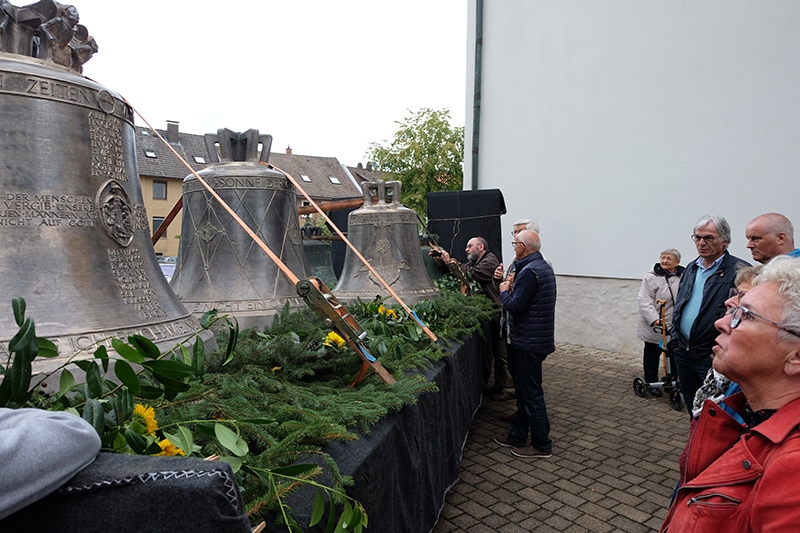 Als Musik zum Ausgang des Gottesdienstes erklangen sie nach 64 Jahren ein letztes Mal. Erst jede Glocke einzeln und zu guter Letzt alle zusammen. Die Gemeinde hatte sich dazu auf der Wiese versammelt. Was in den Köpfen vor sich ging? Wehmut? Sicher! Auch die eine oder andere Träne wurde verdrückt. Dank sei hier noch einmal Familie Züchner gesagt, die 1955 dieses Geläut spendeten.