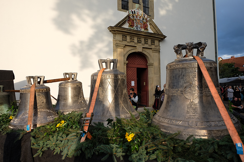 … dann diese Handglocken zur Begrüßung der Jubiläumskonfirmand*innen. Es war schon eine kongenialer Idee, wenn die Züchnerglocken nicht mehr läuten können und die neuen Glocken noch nicht läuten, das Handglockenorchester aus Weimar einzuladen. Viele Menschen kamen, um sich diesen Genuss nicht entgehen z lassen. Doch was hatten sie erwartet? Ein helles Gebimmel oder die Klänge von Almweiden? Alles weit gefehlt!! Schon bei den ersten Klängen wurde allen bewusst, hier einem genau herausragenden Klangereignis beiwohnen zu dürfen. Die weichen Klänge (die Klöppel sind mit speziellem Filz bezogen) entführten in kaum geahnte Sphären. Herzlichen Dank für dieses Konzert!