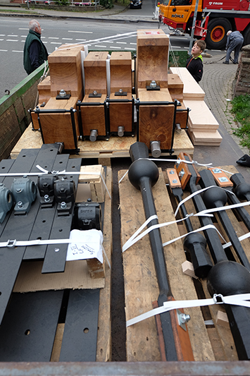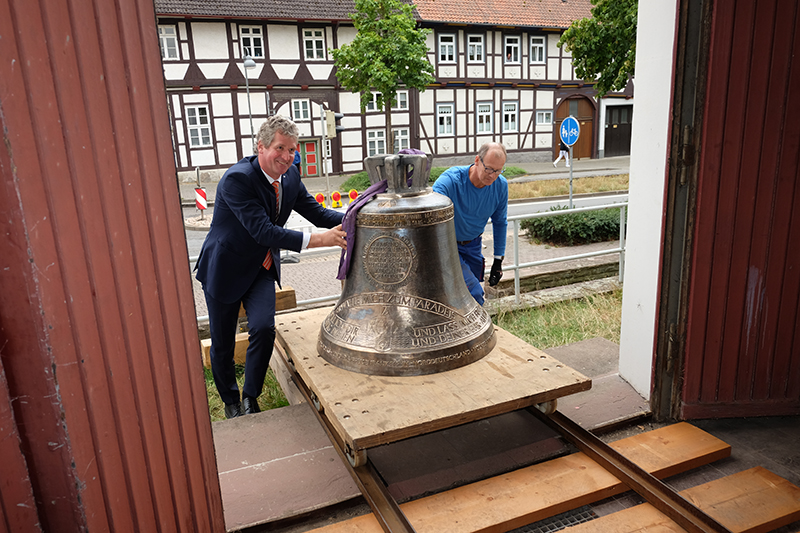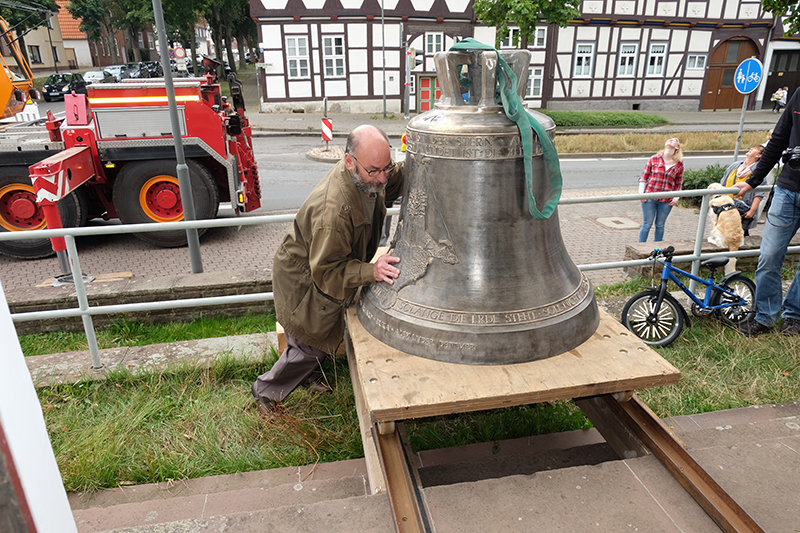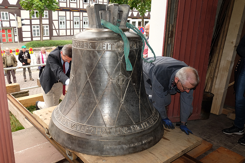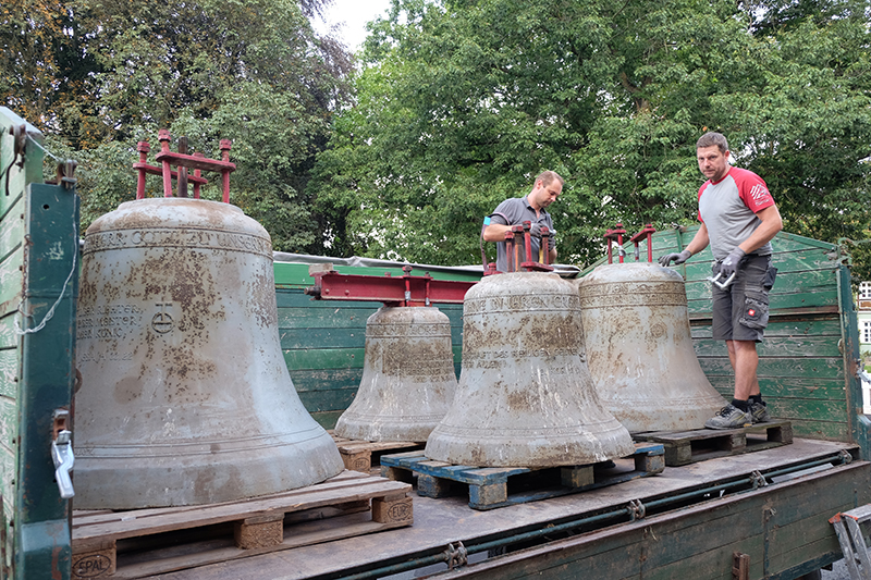 Schließlich waren beide Glocken unten und wurden nach Sinn gefahren. Nach den Sommerferien werden sie mit den vier neuen Glocken nach Seesen zurückkehren und gemeinsam bilden sie dann das neue Geläut im Glockenturm.