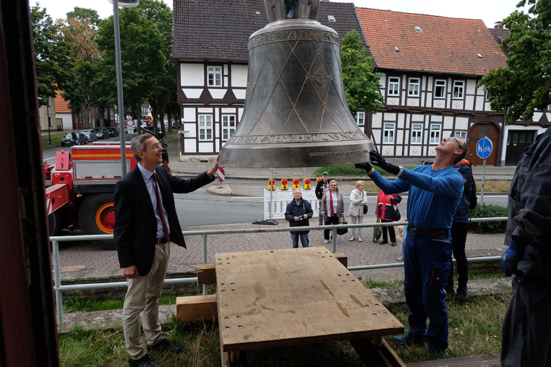 „Nachdem wir die neuen Glocken der Sankt-Andreas-Kirche beim Sehusafest der Bevölkerung vorgestellt haben, folgte nun der nächste Schritt. Pünktlich um 13:00 Uhr wurden die Glocken in den Glockenturm hineingeholt. Zu diesem Ereignis sind dann doch noch einige Seesener*innen gekommen. Und sie staunten wieder wie schon beim Fest über die Schönheit und Einzigartigkeit dieses neuen Geläut. Herr Brinkmann von der Volksbank durfte die Taufglocke, auf deren Wolm die Stifter „VR-Stiftung der Volks- und Raiffeisenbanken in Norddeutschland - Volksbank Seesen“ stehen in den Glockenturm hineinschieben und Herr Dettmer als Stifter die Glocke „Bewahrung der Schöpfung“.