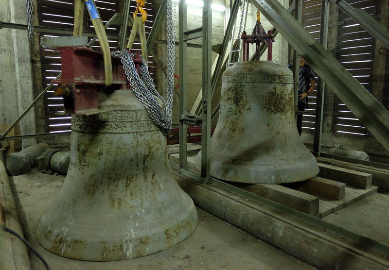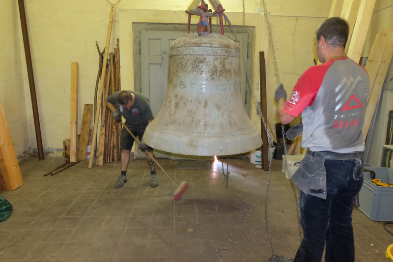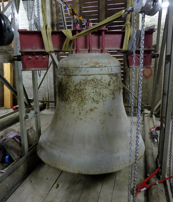 Die Autos der Zimmerei Ständer aus dem thüringischen Geismar machten es allen deutlich: Nun hat der Ausbau der Züchnerglocken begonnen. Es macht dann doch schon ein eigenartiges Gefühl, die beiden großen Glocken an starken Seilen hängend zu sehen (ohne die Läutemotoren) und schließlich auf dem Boden stehend.
