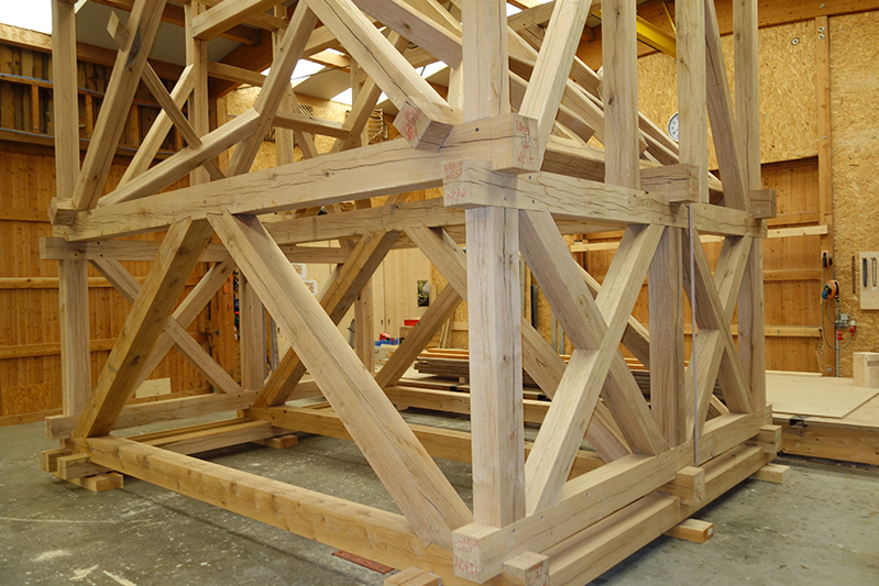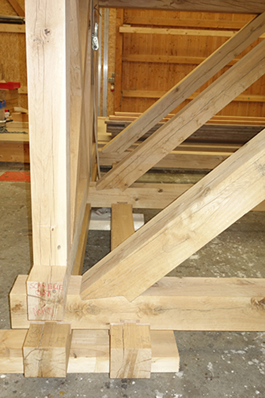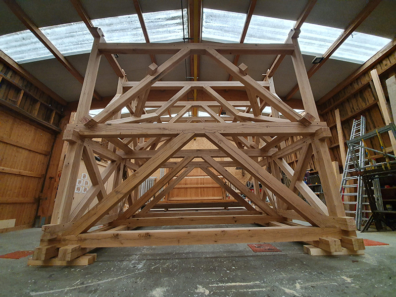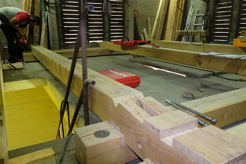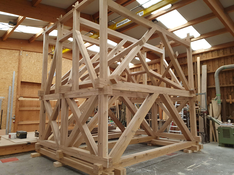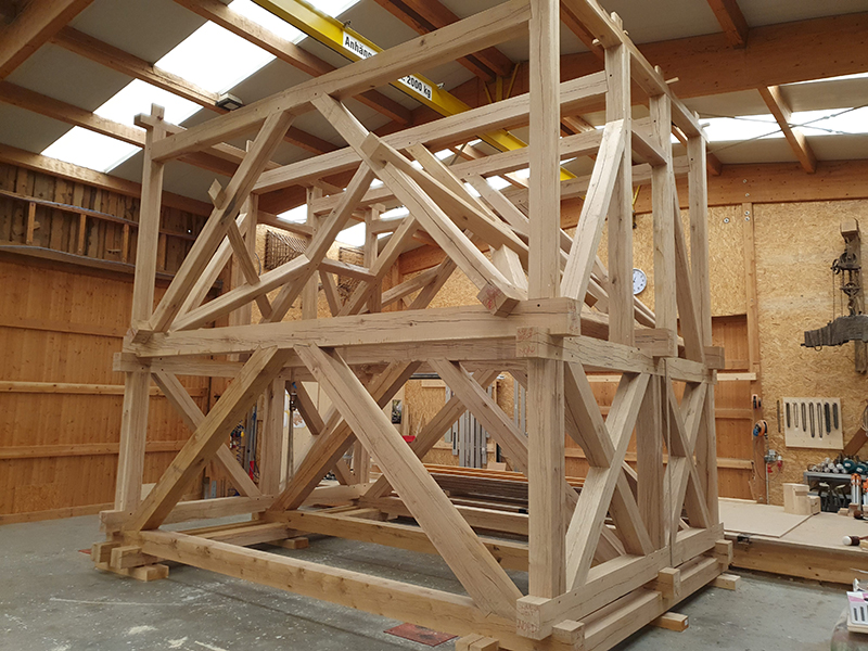 Nur mit neuen Glocken ist es bei einem neuen Geläut nicht getan. Auch der Glockenstuhl beeinflusst den Klang. Der neue Glockenstuhl (dieses Mal aus Eiche) wurde im thüringischen Geismar von der Zimmerei Ständer gefertigt. In deren Halle wurde er auch das erste Mal aufgestellt. So, wie Sie es auf den Bildern sehen können, wird der Glockenstuhl in Gänze nie wieder zu sehen sein, denn er nimmt fast vollständig die gesamte Glockenstube im Turm ein.
