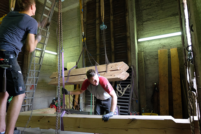 „Am 28. August war es soweit: die Züchnerglocken konnten abgeholt werden. Sei haben nun für immer den Glockenturm verlassen. In naher Zukunft werden sie konserviert und für alle sichtbar ausgestellt. Kaum war „das Alte“ fort, begann der Aufbau des neuen. Durch eine Schallöffnung im Osten des Turmes, wurden die vorgefertigten Balken des neuen Glockenstuhles in die Glockenstube gebracht und der erste Kranz ausgerichtet.“