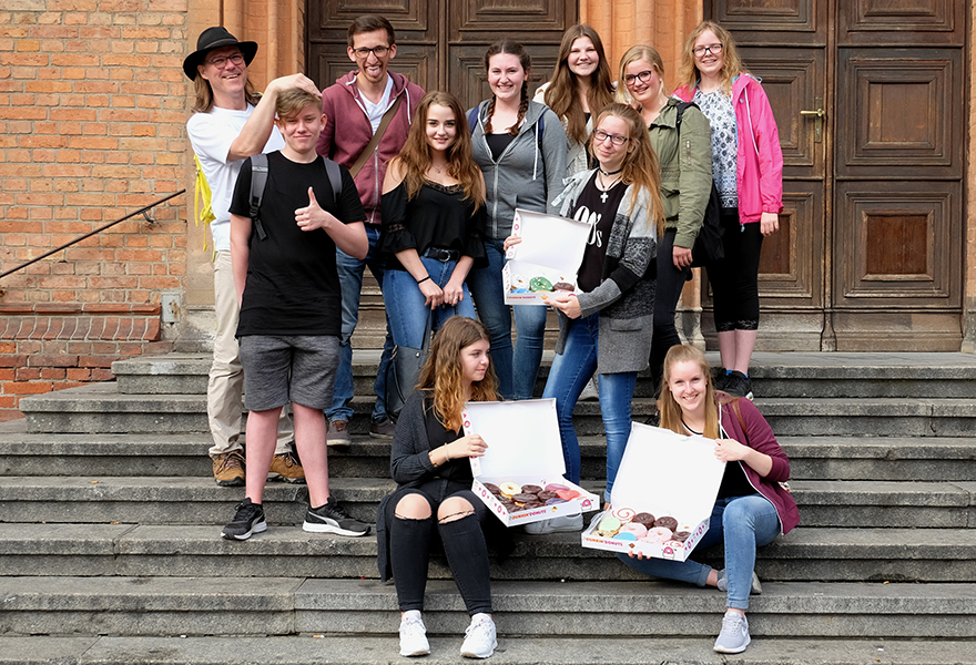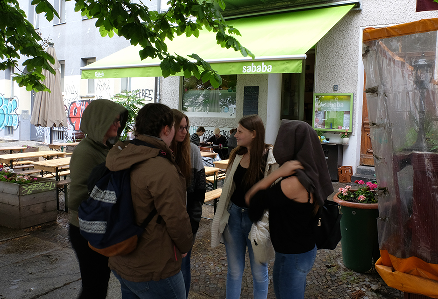 Nach einer Stärkung im „Sababa“ mit israelischem Hummus ging es in die nahegelegene Zionskirche. In Zeiten der Wende Ende der 80er Jahre war sie Treffpunkt für tausender Oppositioneller. Zudem wirkte in dieser damals armen Arbeitergegend Dietrich Bonhoeffer in der Gemeinde und gestaltete Jugendarbeit. Zuletzt gab es traditionsgemäß das Gruppenfoto mit Donuts.