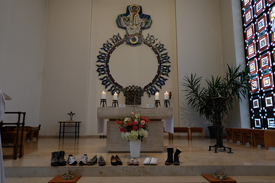Am ersten Samstag des August feierten wir den ökumenischen SchulanfängerInnen-Gottesdienst in der katholischen Kirche Maria Königin. Den Bibelvers „Der HERR wird deinen Fuß nicht gleiten lassen“ aus dem Psalm 121 wurde den Kindern mit Hilfe vieler verschiedener Schuhe nähergebracht. Und der Pfarrer stand sogar barfuß da.